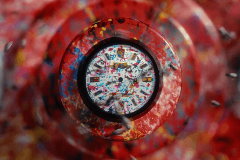 “Time Flies ”一语双关,既指时光飞逝,而“Flies”又指苍蝇。手表代表精准、秩序、永恒;苍蝇代表混乱、短暂、腐败。