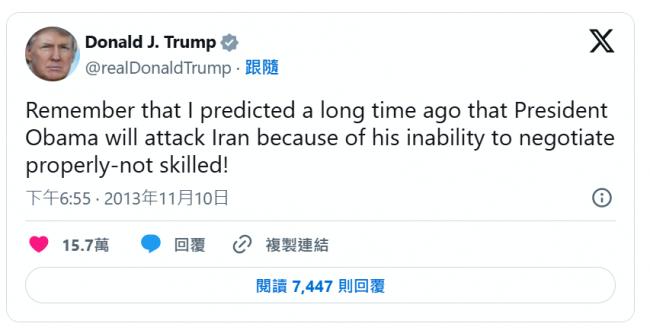 2013年11月11日,当年度被认为是美伊关系从长期对抗转向外交谈判的关键转折点,不过川普不认为奥巴马政府有能力跟伊朗谈成任何事,于是在X发文酸,“记得我很久以前就预测过,奥巴马会攻打伊朗,因为他根本无法好好谈判----讲白话点就是谈判能力不足!”