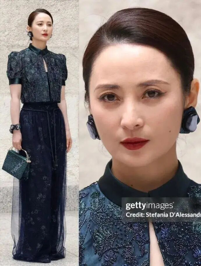 蒋勤勤身着Giorgio Armani蓝绿色手工刺绣套装,她利落盘发凸显流畅面部轮廓,颧骨与下颌线立体分明,360°无死角,堪称“骨相美天花板”。