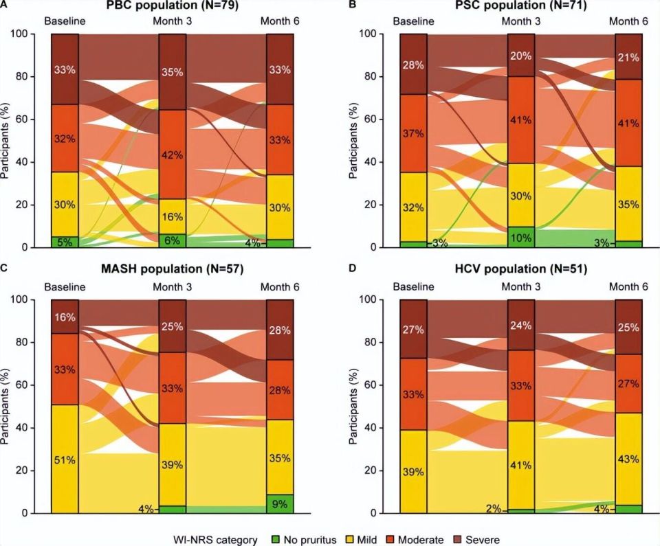 桑基图显示了 ( A ) PBC、( B ) PSC、( C ) MASH 和 ( D ) HCV 患者瘙痒严重程度随时间的变化