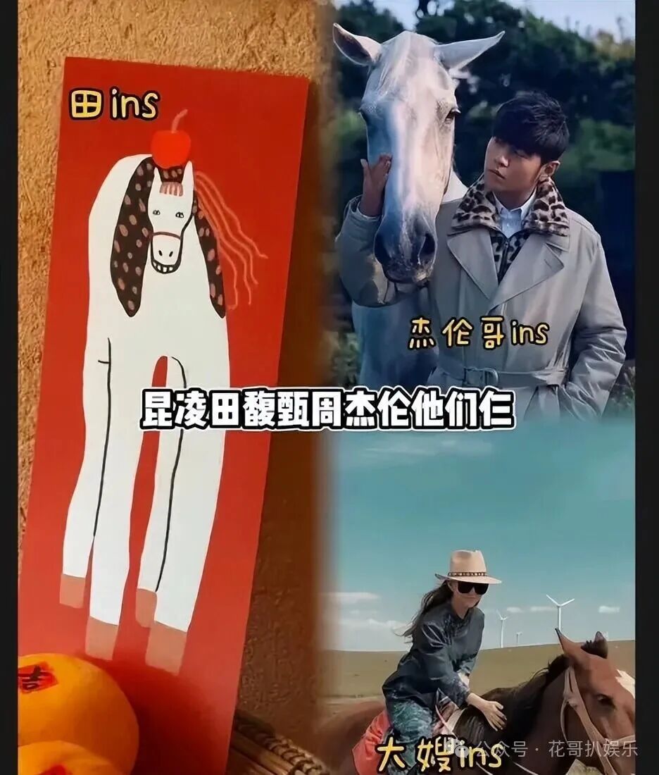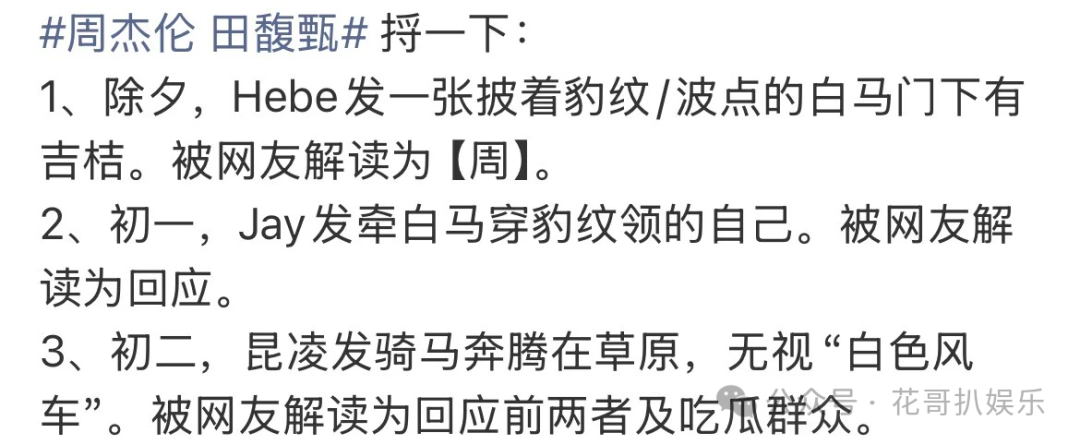 前不久周杰伦还发了白马+豹纹的元素,也有人说他是隔空示爱,因为前不久田馥甄也有类似的图,落在粉丝眼中就是有人隔空传情。现在已经发展到有人说周杰伦和昆凌打算离婚,和田馥甄重修旧好了,不少cp都在梦想自己磕的cp终于成真了。