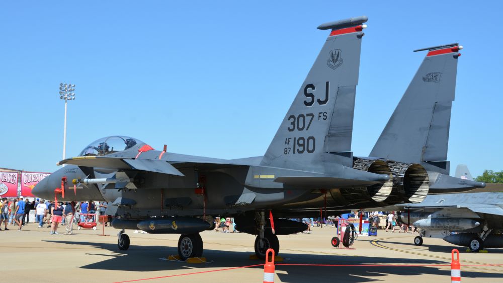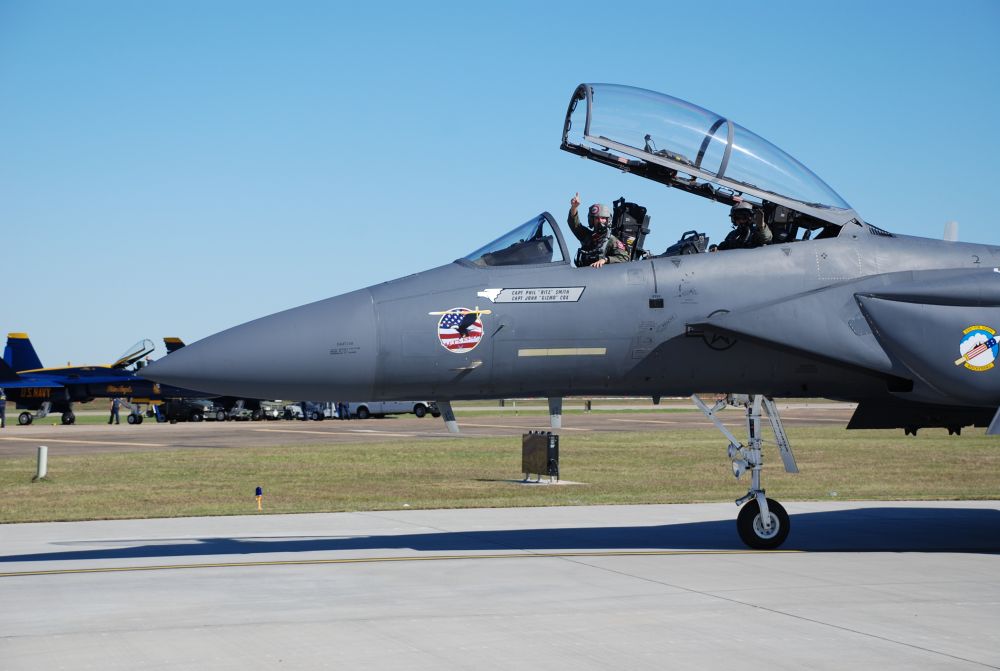 我有幸在近距离看到过F-15 FIGHTING EAGLE双座战斗机。飞机表演落地后,飞行员TAXI滑过场边的观众,飞行员一改严肃认真的态度,性格欢快与观众互动。