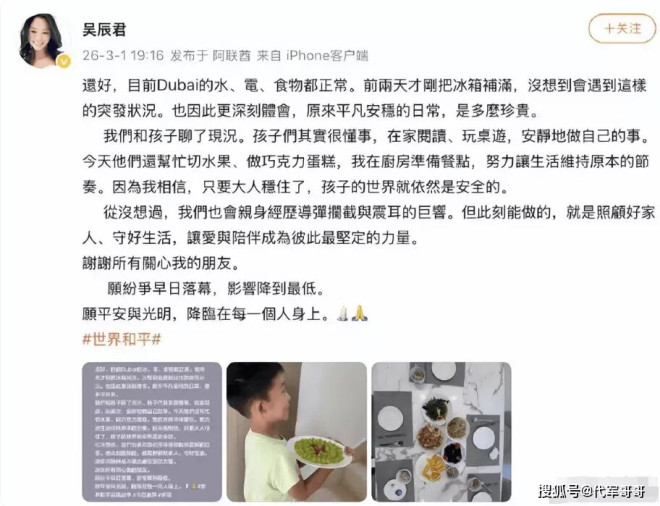 万幸的是,吴辰君此前无意间提前采购,把家里的冰箱塞得满满当当,恰好应对了这场突发状况,无需跟风去超市抢购。随后几天,她连续多次发文报平安,透露目前迪拜的水、电、食物供应均正常,生活物资充足,只是孩子已经改为居家上网课,预计将持续到周三,她也诚心祈祷战争能快点结束,机场能早日恢复正常运作。