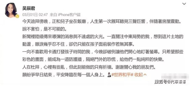 近期,美以对伊朗发动联合军事打击,伊朗展开报复性回击,中东战火持续升级,波及阿联酋迪拜,这座原本繁华安宁的城市,接连传出导弹拦截的巨响和震动。3月1日凌晨,吴辰君在社交平台发文,讲述了自己的惊魂经历:事发时她正和儿子坐在餐厅,突如其来的三声巨响伴随着房屋剧烈震动,让她瞬间陷入恐慌,这也是她人生中第一次亲耳听到炮弹相关的巨响,直言“说不害怕是不可能的”,内心的恐惧让她差点哭出来。