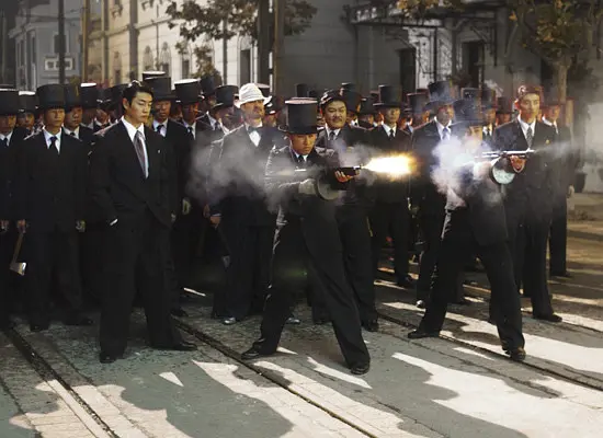 而下层的喽啰们的穿着也是挺可观的,头戴黑色礼帽,腰扎带大铜扣的牛皮宽板带,里面穿布扣的对襟白布褂,外面套一身黑色的杭纺绸的布衫(这也是影视剧给大家留下的第一印象)。
