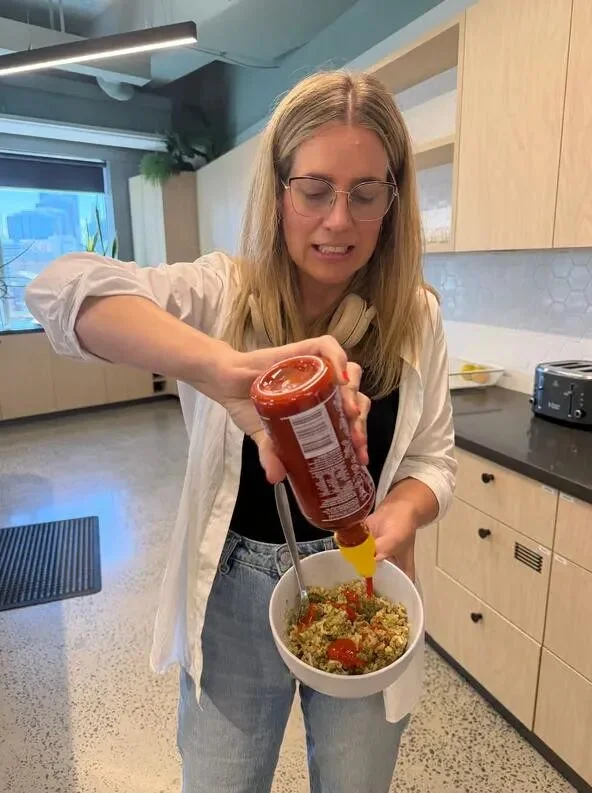 唯一令她欣慰的是,你可以不用光吃糊糊,还可以往里挤点酱,她看的教程里最推荐的是Sriracha辣椒酱,被戏称做“狗粮届的圣水”。