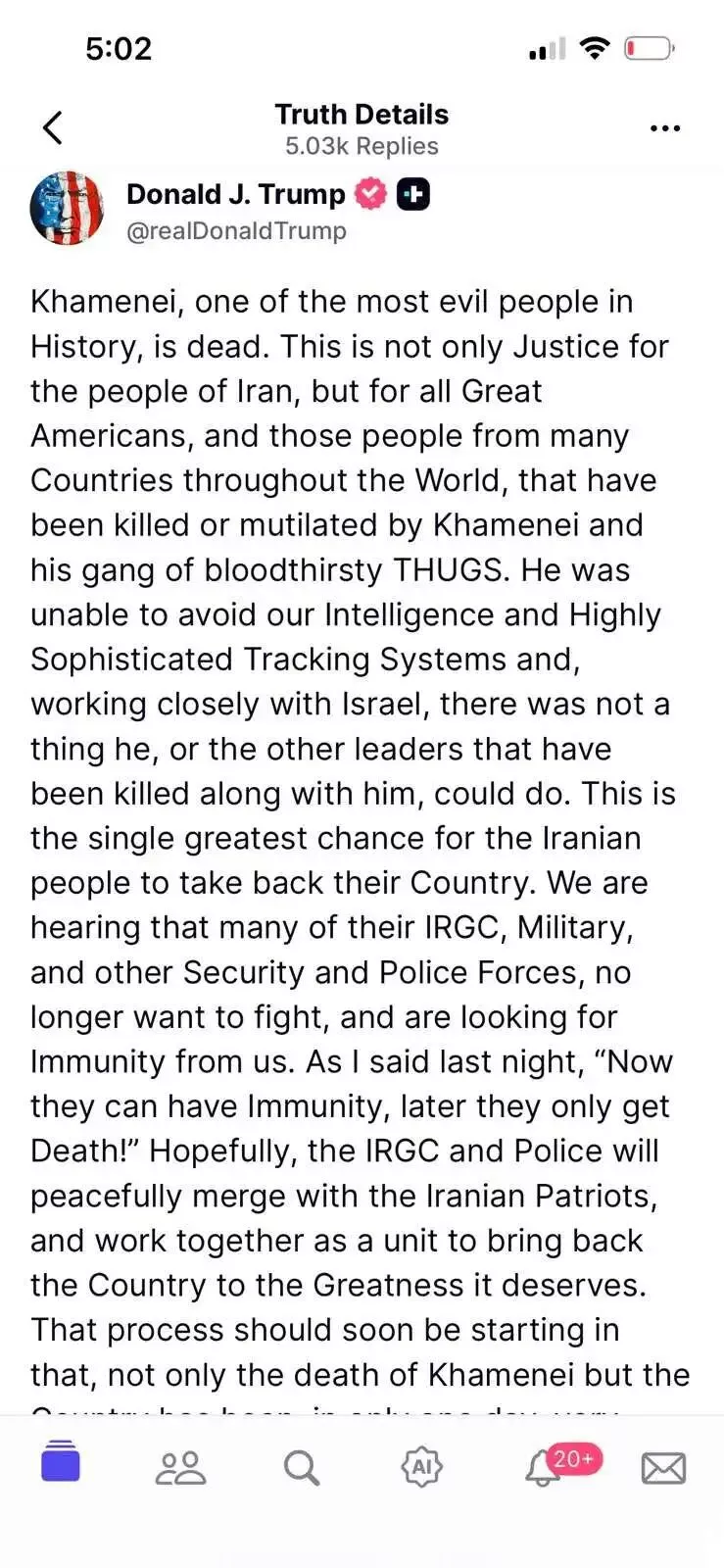 其实在看到特朗普的最新帖文时,我就知道,哈梅内伊已死。特朗普在发布这类大事时,还是在乎他的信用的,不会乱说话。