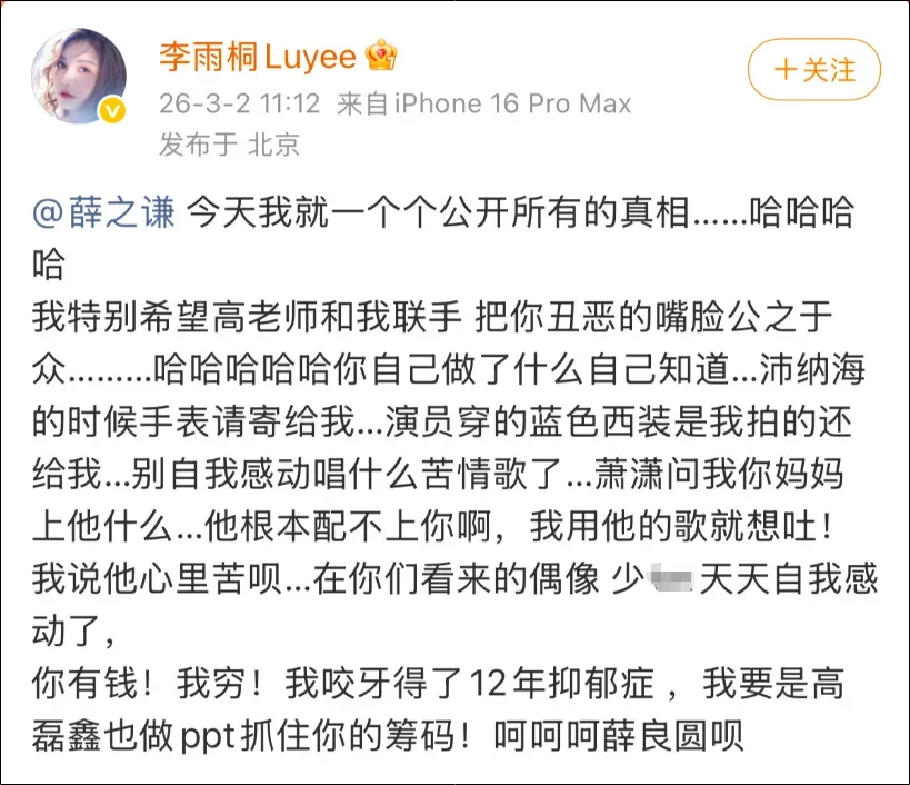 3月2日,薛之谦前女友李雨桐在微博发布多条内容,实名举报薛之谦涉嫌重婚罪,同时铺陈多项血泪控诉。