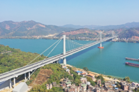 近4年建设历程中,中交二航局建设团队研发了一套用于深水裸岩条件下的大直径桩清水钻成孔快速施工技术,实现高强度裸岩与高环保要求双重约束下的高效成桩;研制了一套快速、稳定的水上搅拌站供料运输系统,每小时可完成160立方米的骨料传输任务;研发了一种应用于大跨径中央塔空间缆悬索桥施工猫道,成功解决主缆架设和主梁吊装阶段主缆中心间距变化大的难题;研制了主缆限位索夹,有效应对施工过程中两主跨不平衡荷载可能造成的主缆滑动问题,为主梁精准吊装合龙提供了坚实保障。 苍容高速的全线通车,进一步完善了广西高速公路网络,对推动北部湾经济区与珠江—西江经济带协同发展,助力广西打造粤港澳大湾区重要战略腹地具有重要意义。
