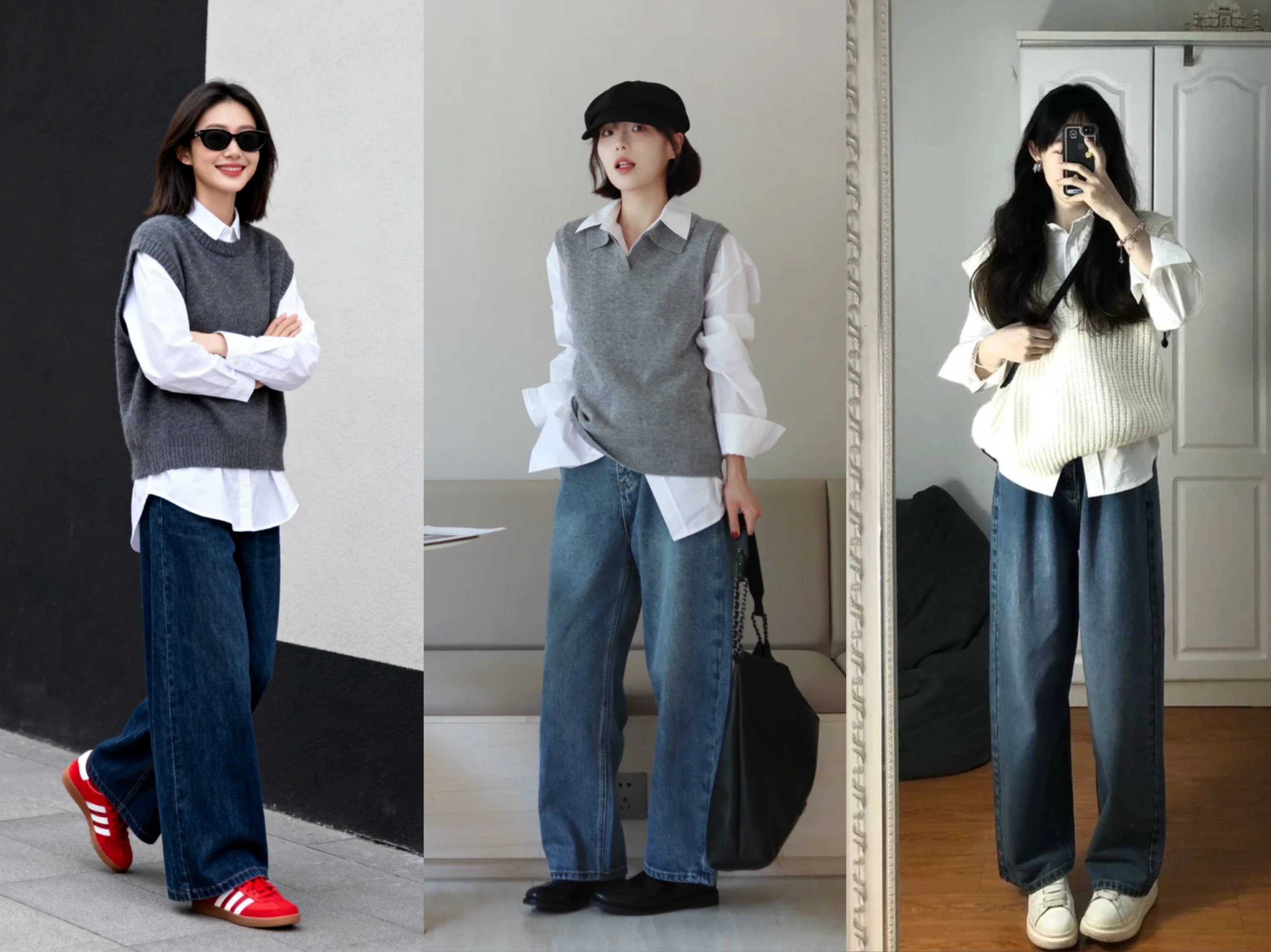 白衬衫在叠穿中应用率非常高,尤其是春季穿搭中,这种非常时髦减龄的学院风叠穿法备受欢迎,比如灰色针织马甲叠穿长款白衬衫,搭配牛仔裤,妥妥的学院风穿搭,哪怕是三十多岁甚至四十岁女性都可以轻松驾驭哦!