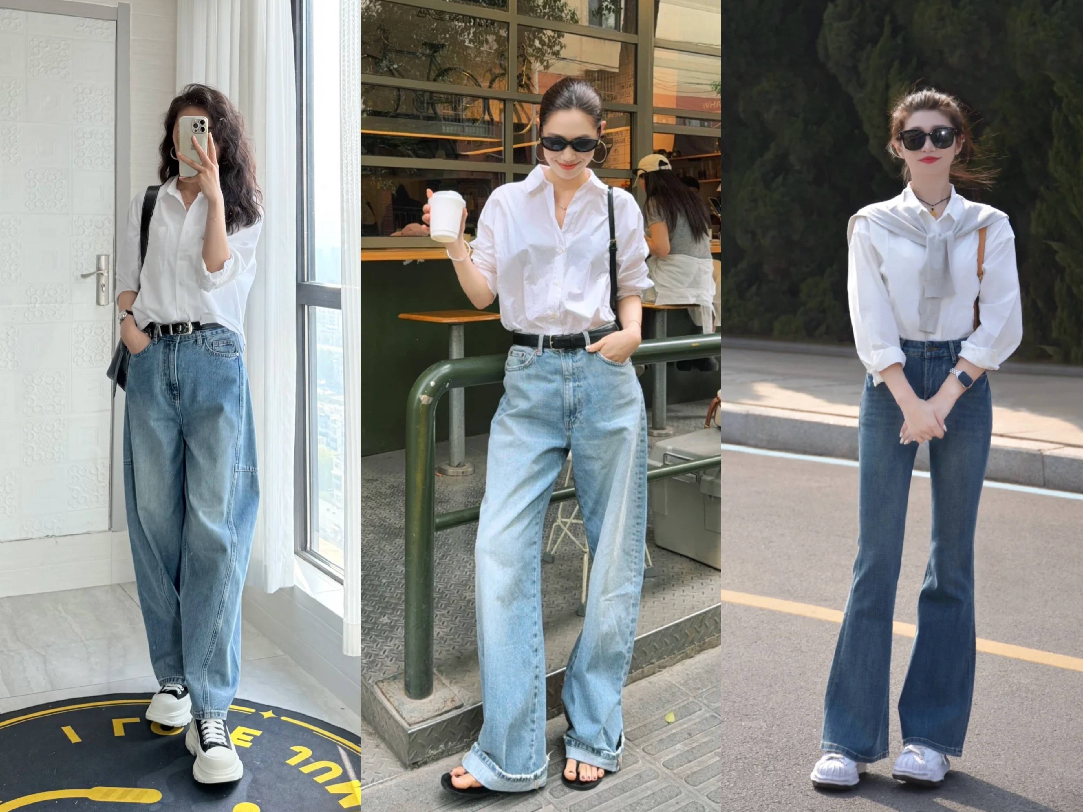 最时髦减龄的搭配方法,莫过于白衬衫+牛仔裤,将衬衫领口的纽扣解开一到两颗,打造随性又帅气的简约风搭配。