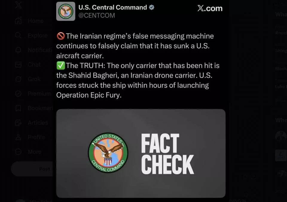 美国中央司令部在回应伊朗在社交媒体上的说法时发表声明称:“伊朗政权的虚假宣传机器继续散布谣言,声称击沉了一艘美国航空母舰。真相是:唯一被击中的航母是伊朗的无人机航母‘沙希德·巴盖里’号。美军在发起‘史诗狂怒行动’后数小时内就击中了这艘航母。”