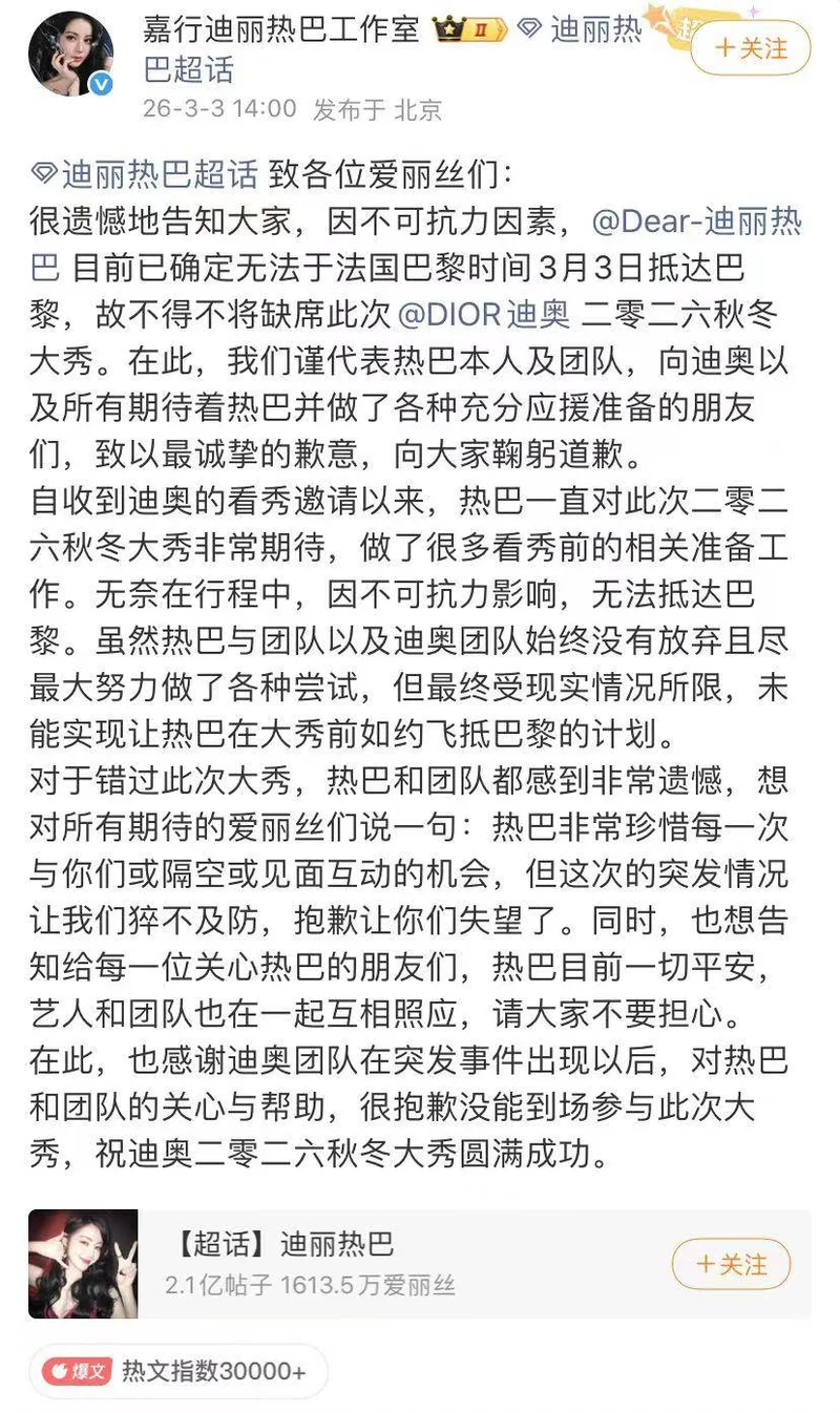 迪丽热巴工作室发布道歉信,估计很多粉丝都非常期待迪丽热巴现身巴黎看秀,因为她是迪奥的代言人,迪奥在巴黎举行大型时装秀。