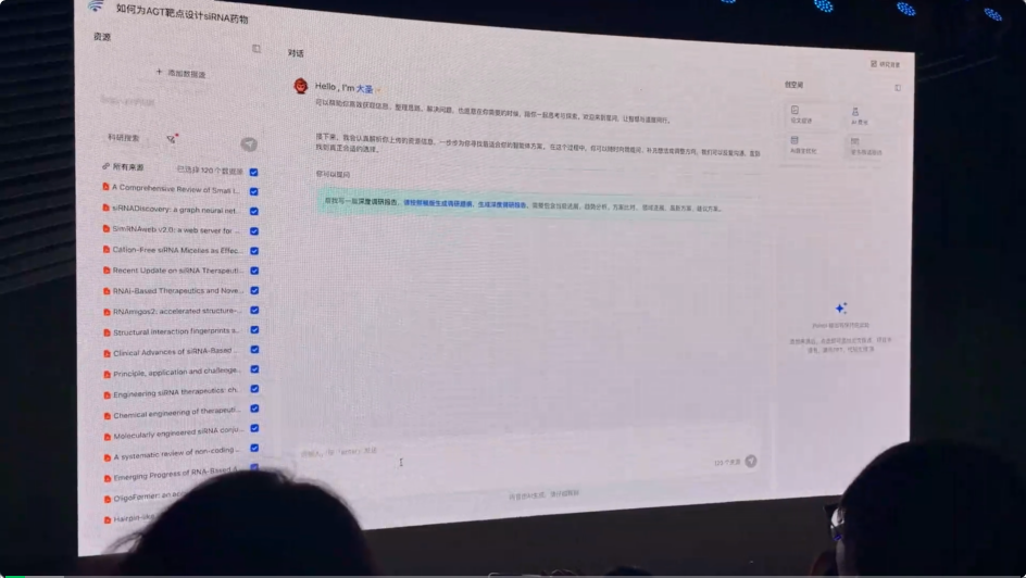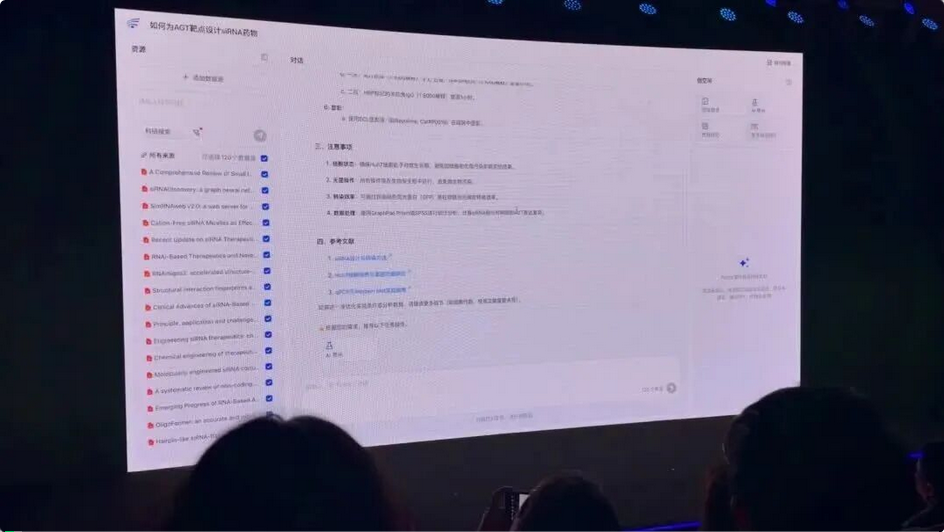 上智院生命科学方向 AI 科学家郭昕现场发起三连问:“AGT 靶点的机制是什么?请帮我设计 20 条 siRNA 序列(需从文献总结规律)?用 Huh7 细胞系设计实验?” AGT 作为治疗原发性高血压的明星靶点,siRNA 药物设计对精准度和验证效率要求极高。