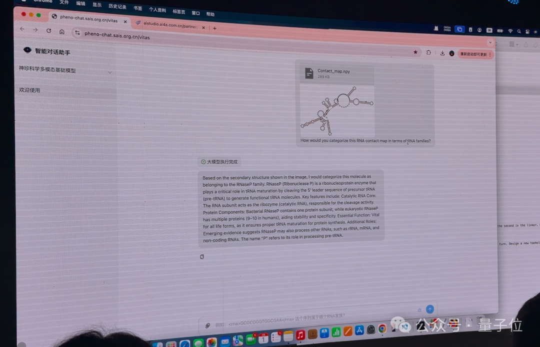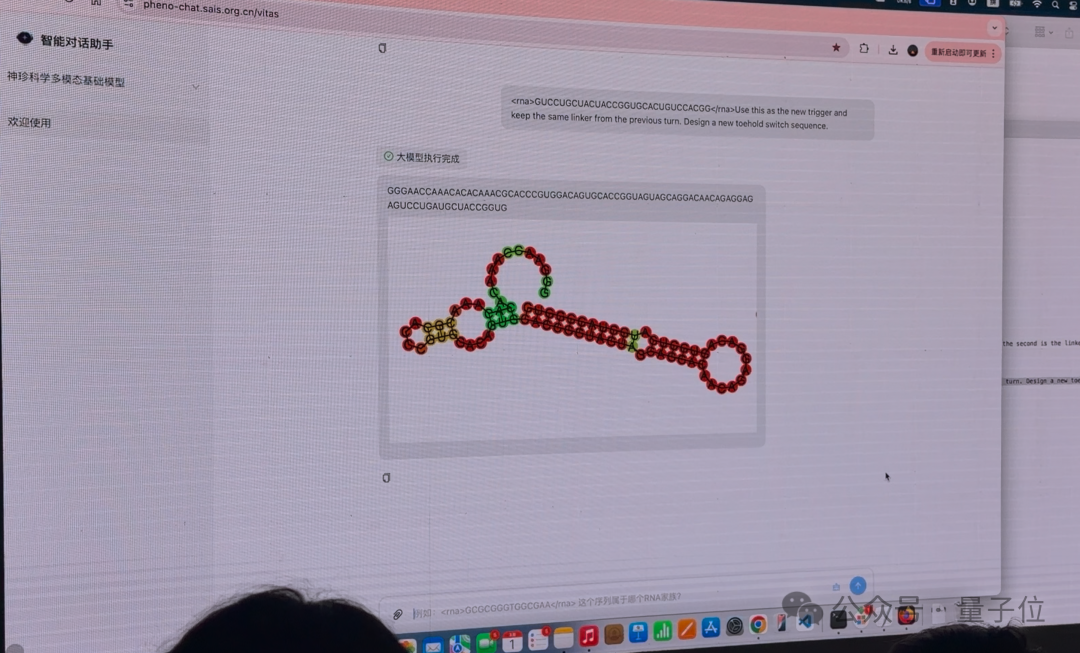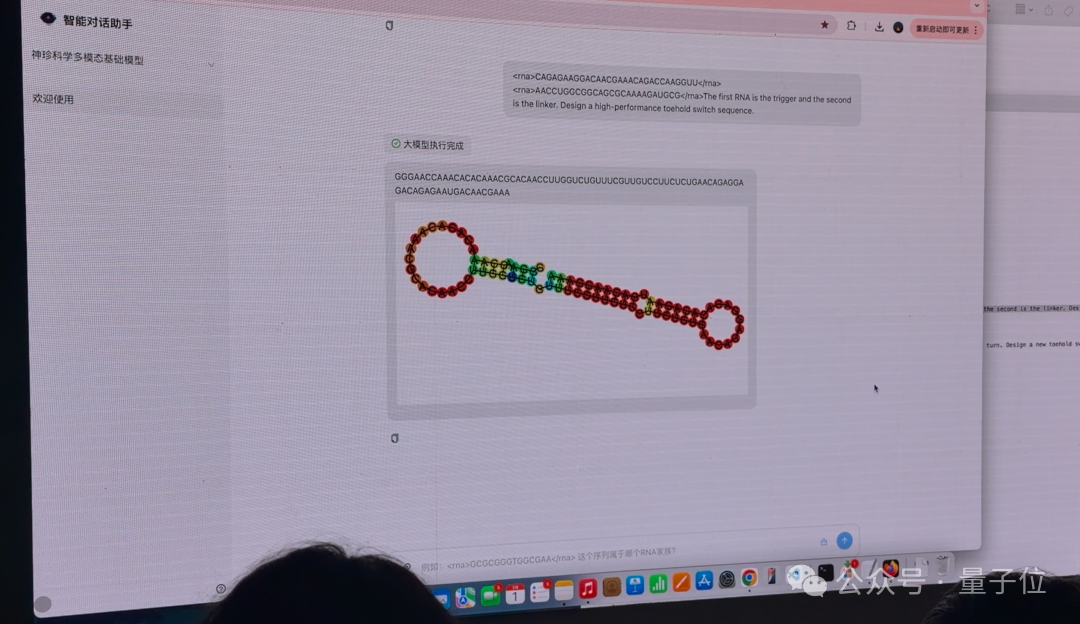 科学数据的模态复杂性(如 RNA 序列、分子结构、气象场数据)是 AI 科研的核心障碍。上智院共性技术部主任研究员谭志羽展示了大圣的多模态处理能力:输入 RNA 二级结构数据并提问 “How would you categorize this RNA contact map in terms of RNA families?”,模型不仅精准分类,还输出细节解析;后续要求设计识别癌变细胞的 Toehold Switch RNA 序列,大圣直接理解多源科学条件,跳过繁琐文本转换,输出可直接用于实验的高性能序列。