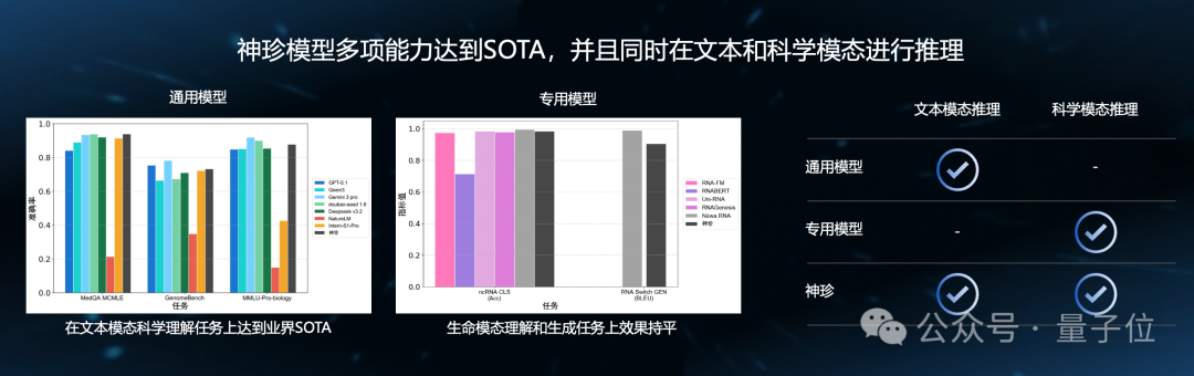 每个科学模态配备专用 Tokenizer,生成高保真 Science Token,输出数据可直接作为输入,具备自反思能力,支撑长周期科研思考。该模型在文本科学推理上达到业界 SOTA 水平,RNA 理解与生成能力与专用模型持平,成为大圣理解科学语言的核心基石。