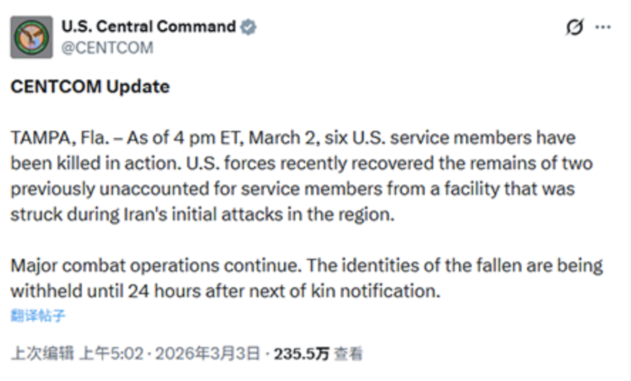 第三天 3 月 2 日,饱和式攻击持续。发射多批次弹道导弹与无人机,对美军在科威特、巴林、阿联酋的基地实施骚扰性打击。有何结果呢?伊朗宣称累计 560 美军伤亡,美方正式官宣,6 名美军死亡,18 人重伤。