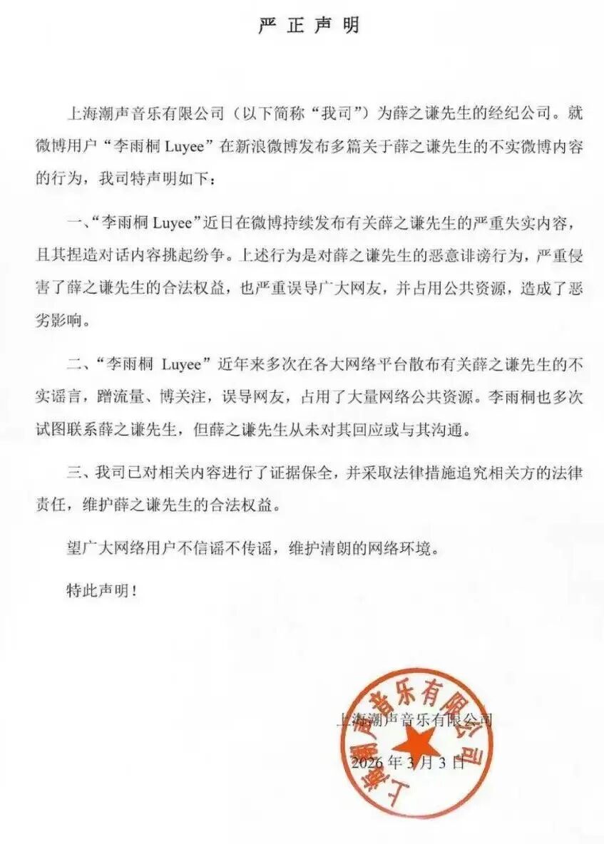 刚刚,薛之谦方@潮石音乐发布严正声明回应: