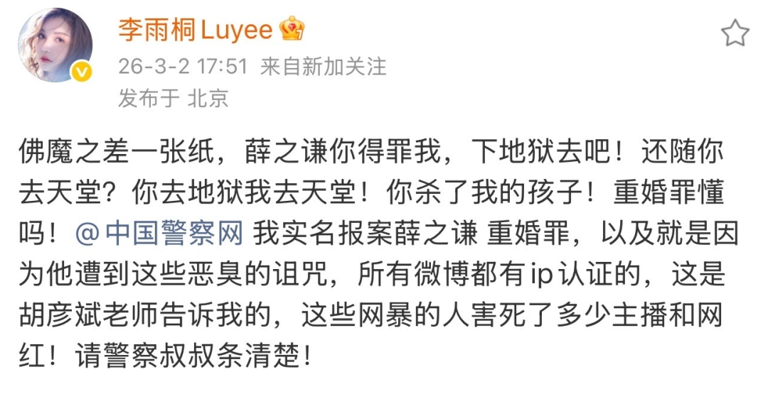 3月2日,歌手薛之谦前女友李雨桐通过微博实名举报薛之谦涉嫌重婚罪,连发多条“爆料”喊话薛之谦,指控其导致自己堕胎及长期遭受网暴,“要公开所有真相”。