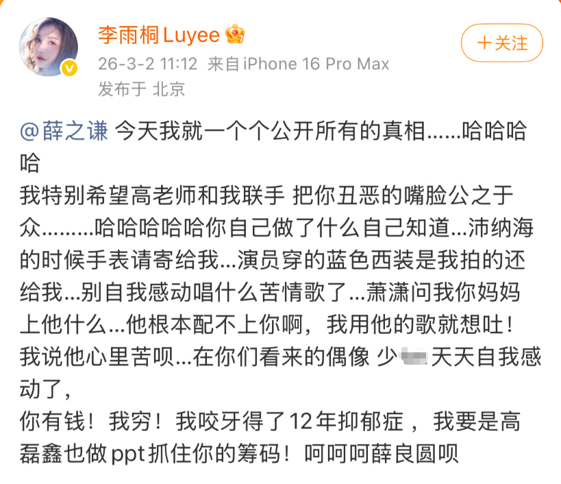 此前,李雨桐公开喊话薛之谦:“今天我就一个个公开所有的真相”,“把你丑恶的嘴脸公之于众………哈哈哈哈哈你自己做了什么自己知道”,并要求其归还手表、西装等物品,她还在评论区补充:“君子报仇,十年不晚。”