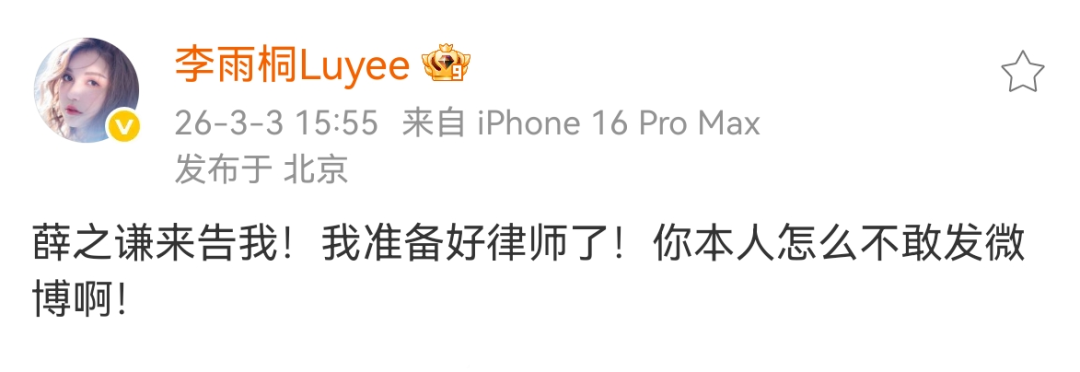 随后,李雨桐回应:“薛之谦来告我!我准备好律师了!你本人怎么不敢发微博啊! ”