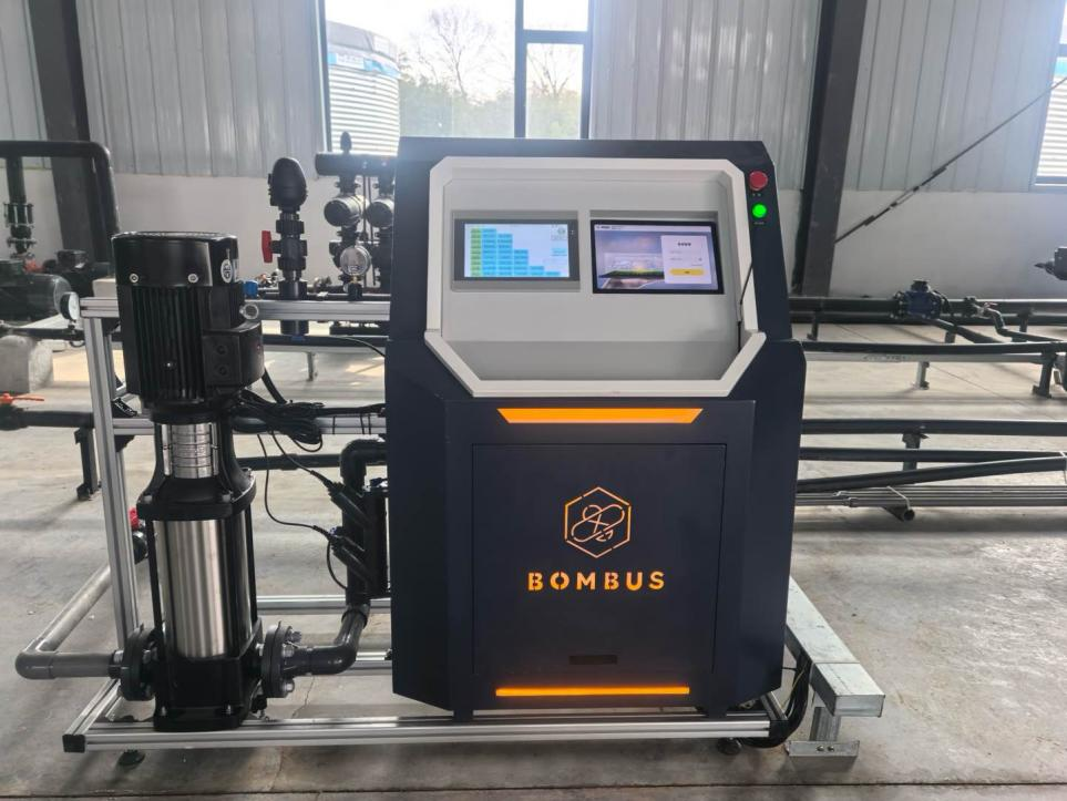 在熊卫华的带领下,众人走进一处钢结构建筑中,只见其中遍布水罐、过滤器、水泵、水管、仪表等。在温室的一角,一台外形酷似自动取款机、带有“BOMBUS”品牌标识的设备发出低沉的嗡嗡声,LED灯闪亮着。