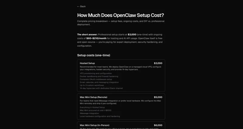 托管安装(3000美元):部署于云端VPS,包含安全加固、主流应用集成(邮件、日历等)及3个自定义工作流。提供14天的专属售后支持(Hypercare)。