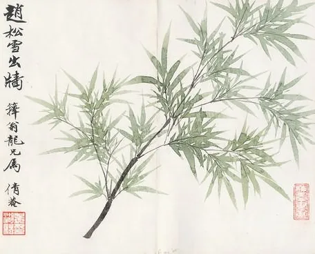 (六)宋人双钩竹,都施石绿为之。迄元王若水以飞白法缀于花鸟间,惟明金本清乃成专学矣。同时尚有王子约者亦善此。倩菴并识。