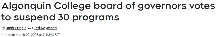 阿冈昆学院(Algonquin College)理事会已投票决定暂停30个课程。该学院目前正面临资金短缺以及国际学生入学人数下降的双重压力。