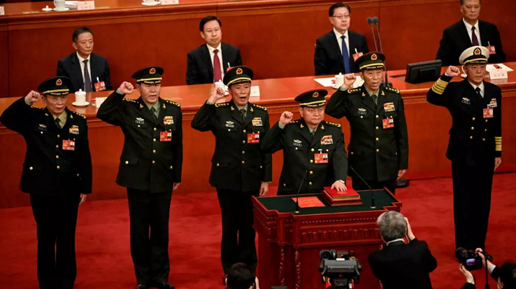 图为2023年3月11日,在北京市人民大会堂举行的全国人民代表大会第四次全体会议上,张又侠(前排)作为新当选的中华人民共和国中央军事委员会副主席,与中央军委委员(从左至右)张升民、 刘振立、何卫东、李尚福、苗华等委员共同宣誓。不过,到了2025年10月,图片中宣誓的高级将领只剩下张又侠、张升民和刘振立,其余全部落马。 via REUTERS - Pool