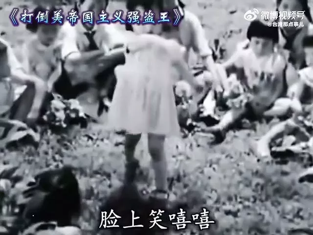 “美国佬是强盗,脸上笑嘻嘻,背后挂大刀,见了好东西,什么都想要,要不到他就抢,霸了土地占了房,杀人放火样样干,他的野心比天大,想拖住那地球往家里搬;全世界的小朋友要勇敢,不管他有多么凶,我们的力量比他强,大家齐心团结紧,打倒美帝国主义强盗王。”