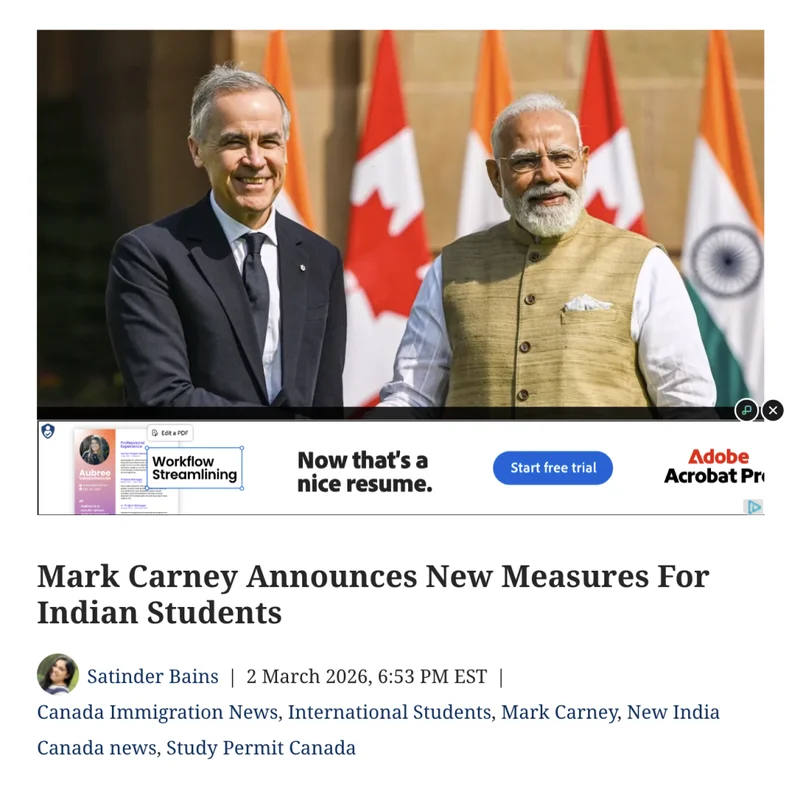 加拿大总理马克·卡尼在2026年3月2日结束的对印度访问期间,宣布了五大针对印度留学生的全面新措施。