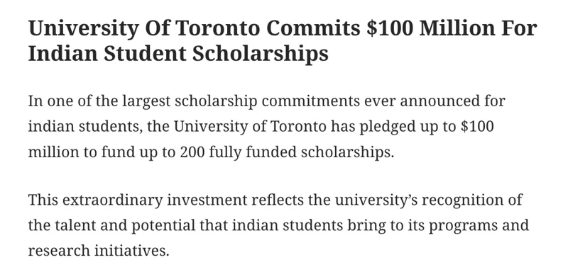 多伦多大学宣布了一项针对印度学生的最大规模奖学金承诺,承诺投入高达1亿加元,用于资助多达 200 个全额奖学金名额。