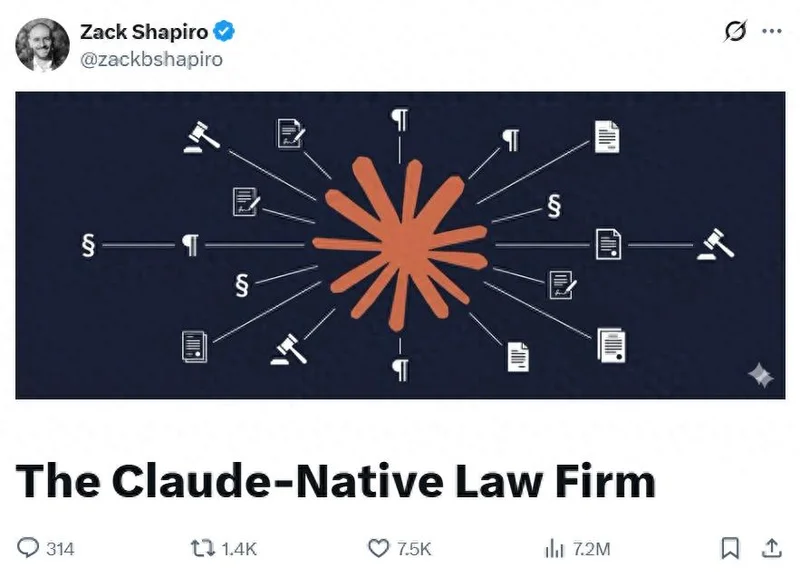 让他引发热议的,并非他们使用了 AI 的事实,而是他彻底摒弃了市面上昂贵的“法律专用 AI”,仅凭一个通用的 Claude 账号和一套自建的指令系统,实现了对传统工作模式的重构。