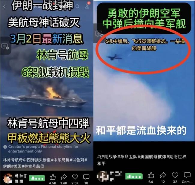 当然,比这更夸张的还在后面。有视频称“伊朗一战封神,美航母神话破灭,林肯号航母中四弹,甲板燃起熊熊大火”“勇敢的伊朗空军中弹后撞向美军舰”。文案很感人,内容很SB。
