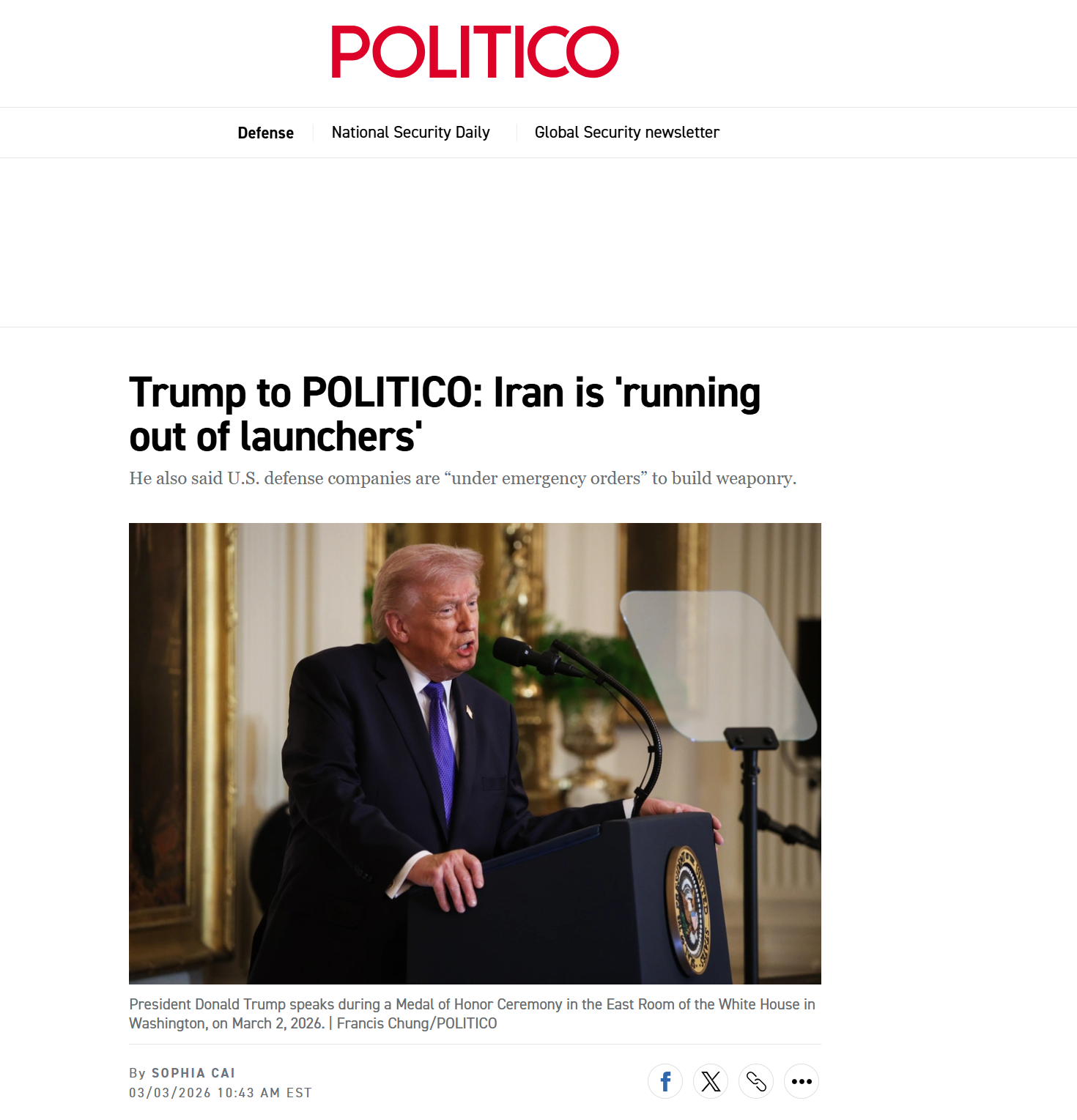 据美媒Politico报道,特朗普(专题)最新表示,伊朗的关键军备正趋于枯竭,并称他愿意与该国统治政权中幸存的部分成员展开合作。