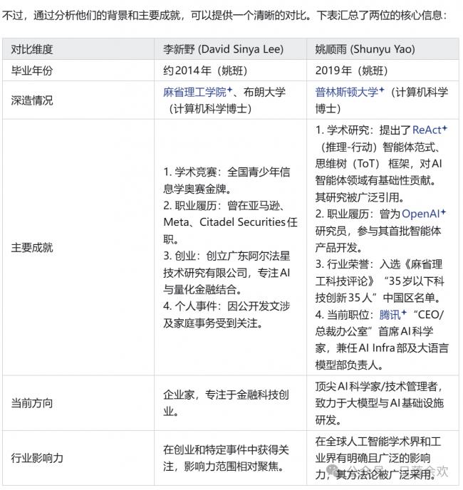 清华姚班的含金量如果要与时俱进的量化一下,那就不得不提一下,25年被腾讯用上亿薪资挖到手的前OpenAI员工姚顺雨。知乎上还有老哥,列了表格来对比这两个天才: