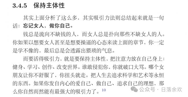 李新野在字里行间流露出一种对女性智性的深度蔑视。他写道:“不要试图和女人讲道理,她们的脑回路里没有逻辑。” 这种傲慢让他产生了一种造物主般的错觉,仿佛只要输入正确的指令(情绪、打压、忽冷忽热),就能像操控后台数据一样控制女性。他利用“补偿心理”(“让她觉得跟你在一起是对窝囊老公的降维打击”)和“戒断反应”(“当她习惯了你的情绪供给后突然切断”),将女性困在他亲手设计的、名为“自由”的牢笼里。