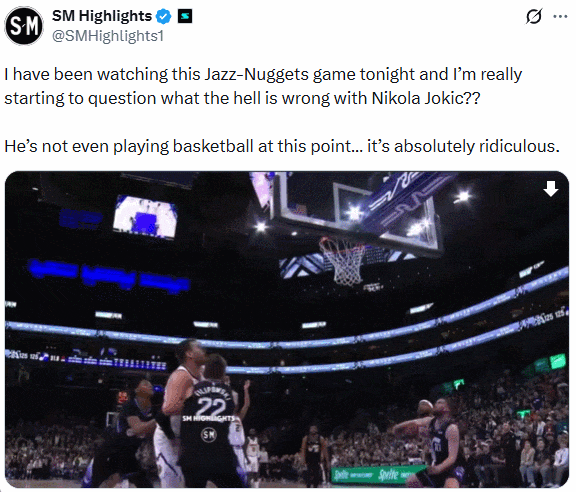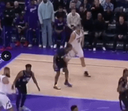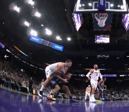 重点说说约基奇,这场确实不太好看。比赛里有非常多让人莫名其妙的回合和动作,比如下面这个回合 —— 按照国外媒体所说的,根本不像是篮球动作的动作。