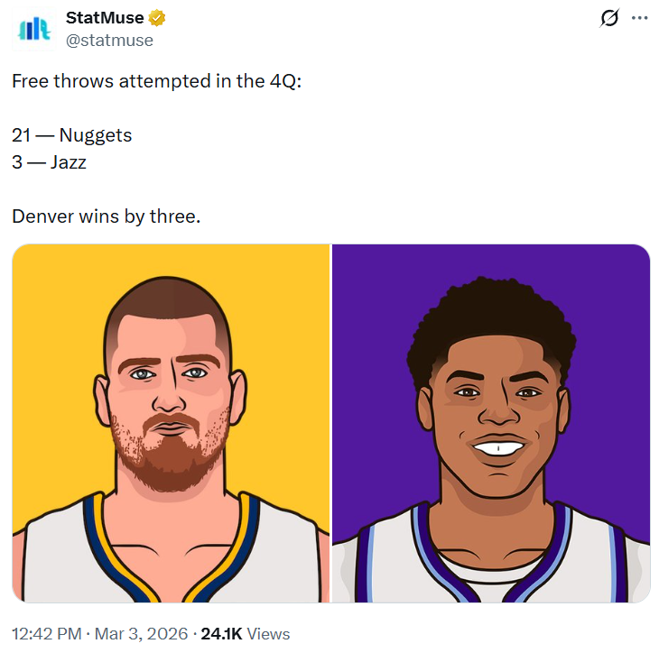 第四节单节,两队的罚球数据对比更加夸张:爵士单节罚球 3 中 3,掘金单节罚球 21 中 20,其中约基奇末节 7 罚 6 中,穆雷末节 6 罚 6 中。