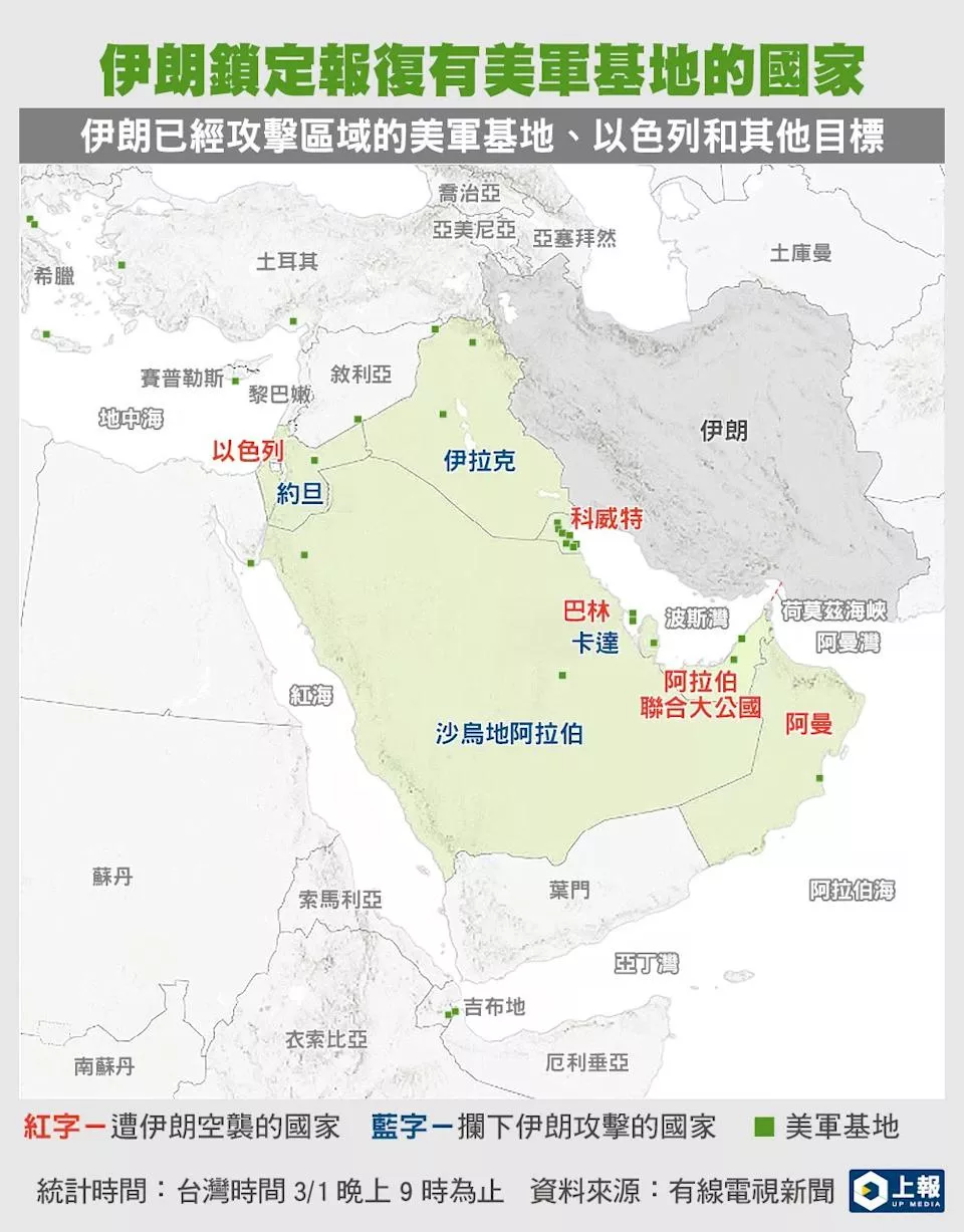 美国与以色列联手对伊朗进行打击,使德黑兰神权政府自去年之后,再度面临重创,伊朗也随之展开报复攻击,让波湾区域陷入高度动荡与纷乱之中,外媒则利用地图进行标记,使各界能够快速掌握截自目前为止的局势发展。
