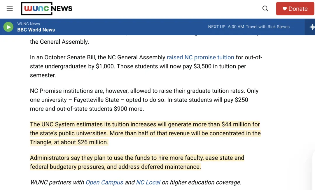 我们先看学校怎么说。这次涨学费预计将为整个系统带来 超过4400万美元 的额外收入。其中超过一半(约2600万美元)会集中流向“科研金三角”地区的几所大学(UNC教堂山、NC州立等)。校方管理层表示,这笔钱计划用于:雇佣更多教师、缓解州和联邦的预算压力、以及解决积压的设施维护问题。