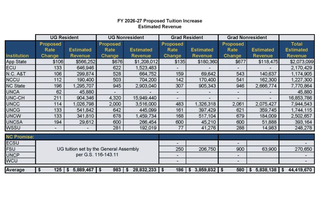 就在几天前,美国北卡罗来纳大学系统(UNC System)的董事会,结束了自2017年以来对州内学生学费的冻结,正式通过了2026-2027学年的涨学费提案。