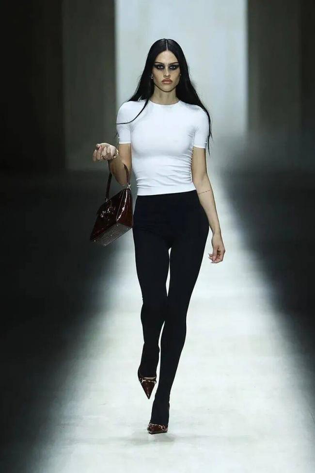 在Demna过往的设计中,与当下文化的碰撞始终是不可忽视的线索。模特被“包裹”进紧身背心、低腰裤与弹力筒裙之中,性感不再需要仪式化的铺陈,而是自然嵌入日常节奏之中,像是一种随时可进入的状态。