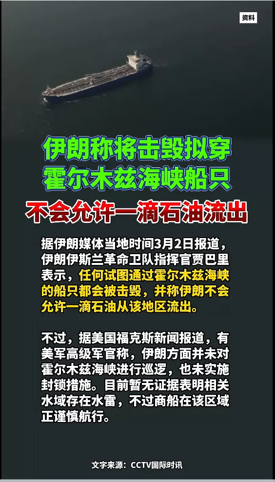 2月28日,美国和以色列对伊朗发动军事打击,伊朗伊斯兰革命卫队当晚宣布,禁止任何船只通过霍尔木兹海峡。据伊朗迈赫尔通讯社3月1日报道,一艘未经授权的油轮试图通过霍尔木兹海峡时被击中。