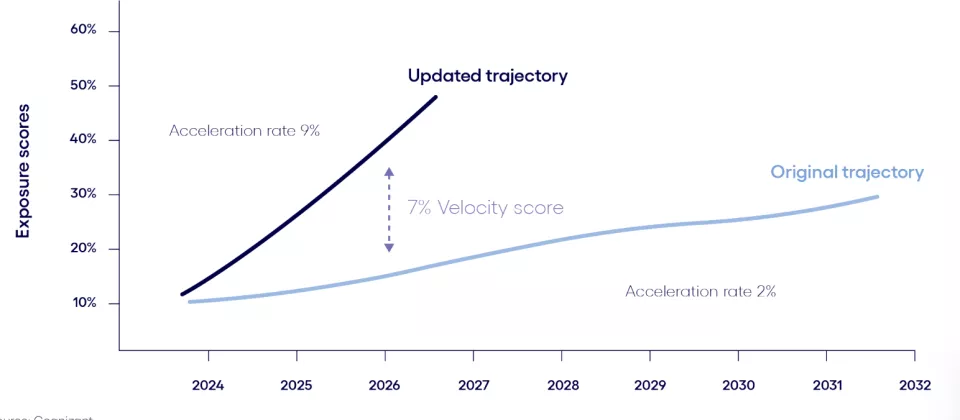 Cognizant用了一个指标叫「速率得分」(VelocityScore),说白了就是你的职业被AI吃掉的速度有多快。