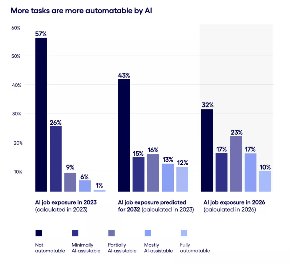 Full automation-完全可自动化,10%的任务(这是2023→2026最大的跃升,从1%到10%)