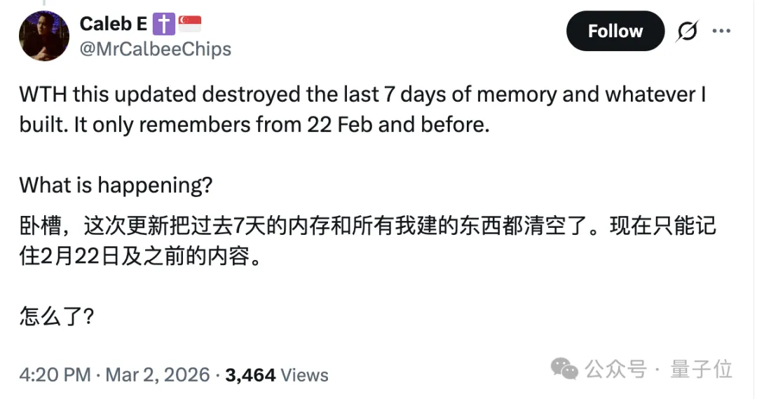 已经有网友反馈,自家龙虾在更新后记忆被清空了。