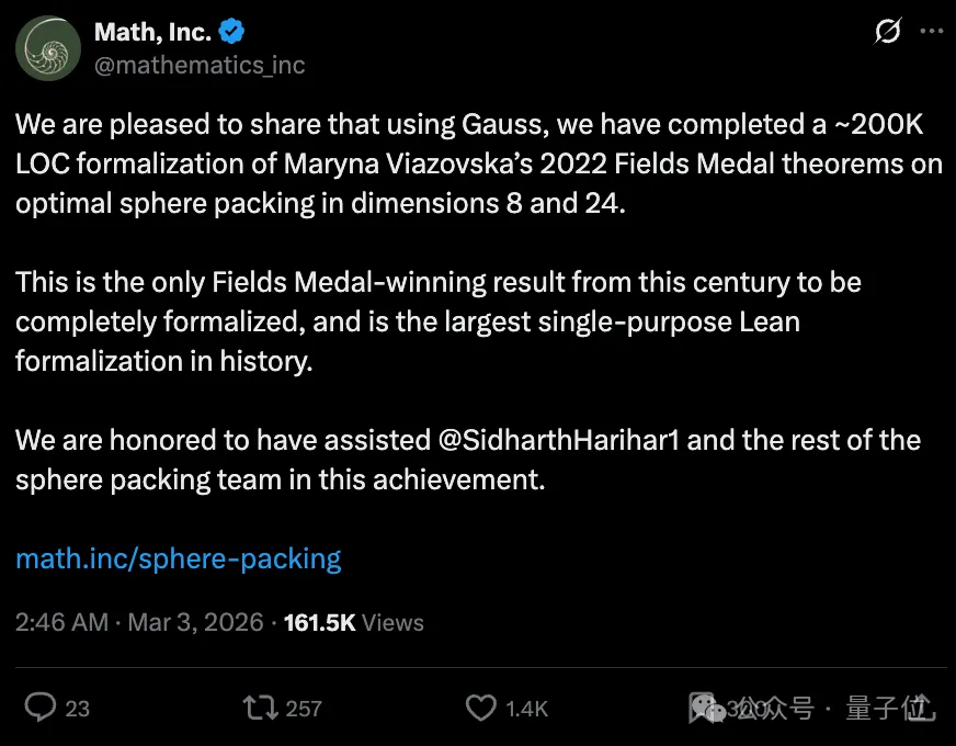 AI是来自Math这家公司名为Gauss的AI。具体完成的工作,是形式化验证了让Maryna Viazovska在2022年获得数学最高奖——菲尔兹奖的成果:关于8维和24维最优球体堆积问题的定理。