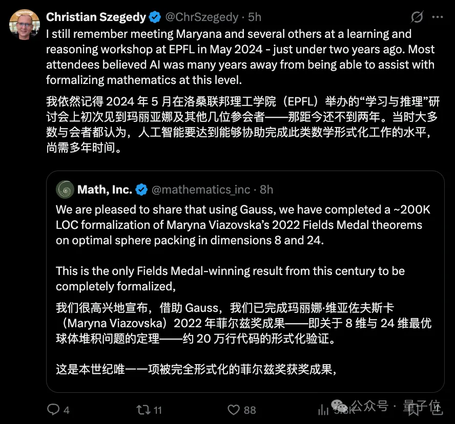 在当时,外界对于Gauss这样的AI Agent,还有许多质疑,包括自动化的程度、对数学问题隐含目标的忽略……但现在,正如Christian Szegedy自己所说: